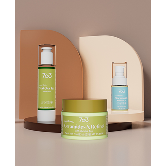 Indulge your skin with a whole, rejuvenating skincare routine with the 7o3 Green Tea Bundle all-in-one essentials kit for looking glowing and healthy skin. The Green Tea Bundle gives you face wash; niacinamide face serum, and fragrance-free moringa night cream to cleanse, brighten, and nourish your skin anytime.